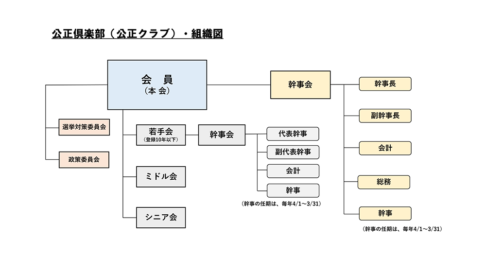 役員は、幹事長・副幹事長・総務・会計・顧問、その他幹事複数名である。